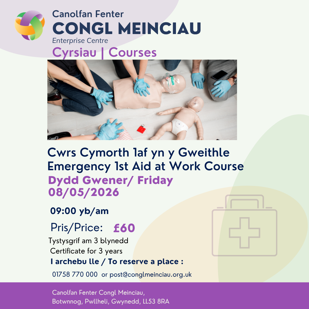 May 08, 2026 – 9:00 am Emergency First Aid at Work Course Congl Meinciau, Botwnnog Enquire about Event Your Name* Your Email* Number of Attendees Please provide any further information