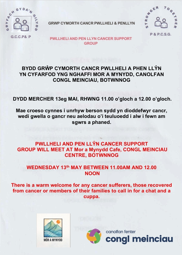 May 13, 2026 – 11:00 am Pwllheli and Pen Llyn Cancer support group Congl Meinciau, Botwnnog Enquire about Event Your Name* Your Email* Number of Attendees Please provide any further information