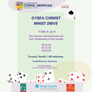 Apr 29, 2026 – 7:30 pm Whist Drive Congl Meinciau, Botwnnog Enquire about Event Your Name* Your Email* Number of Attendees Please provide any further information
